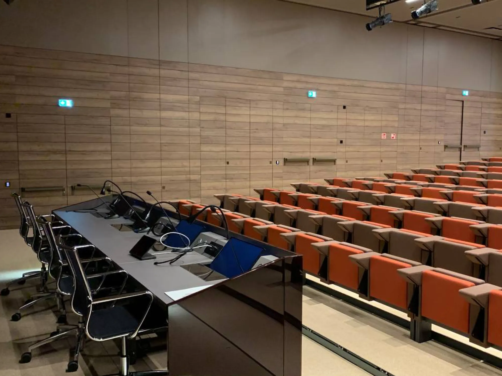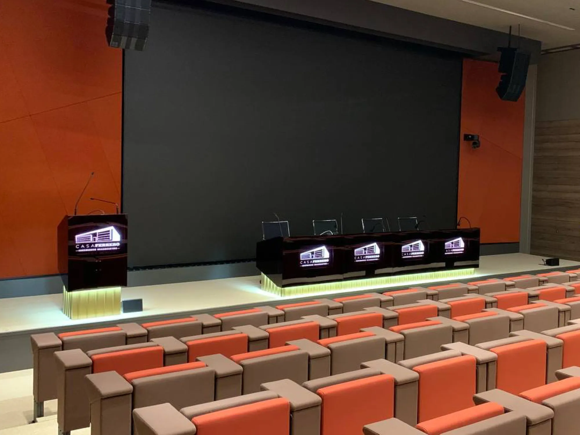 The tables and podiums are designed to accommodate cabling, simultaneous interpreting systems, digital screens, multimedia and domotic devices, ensuring order, accessibility and maximum technical discretion.