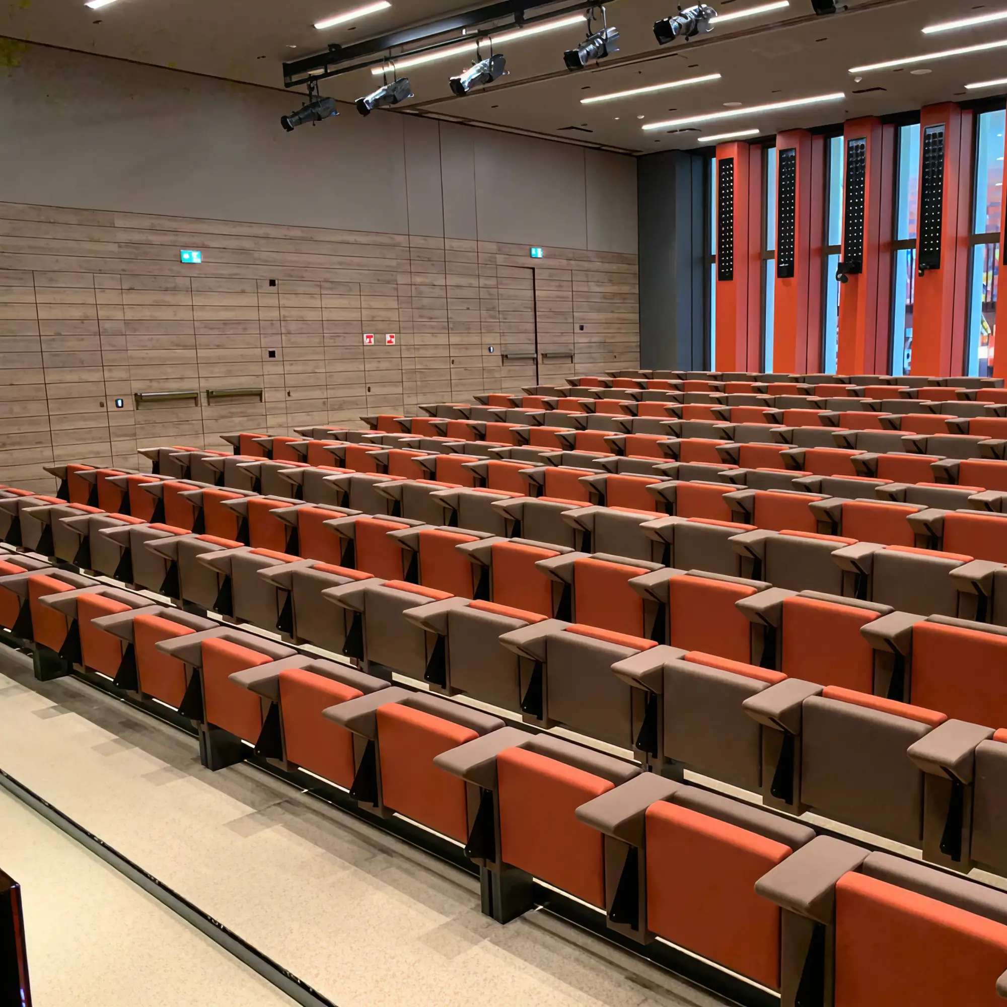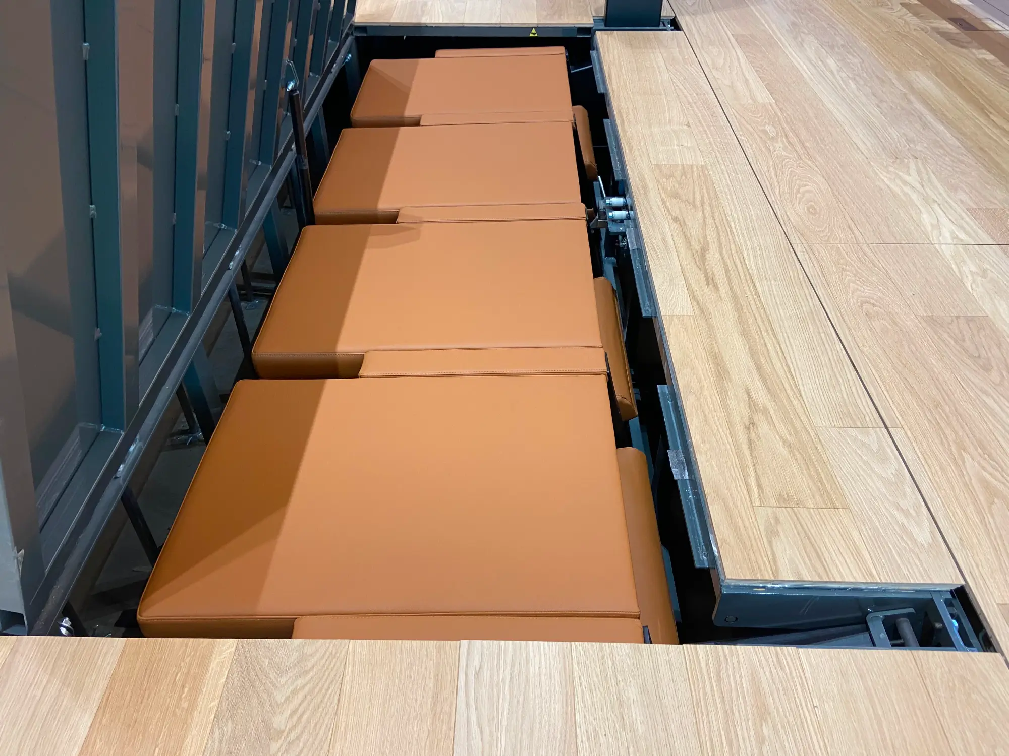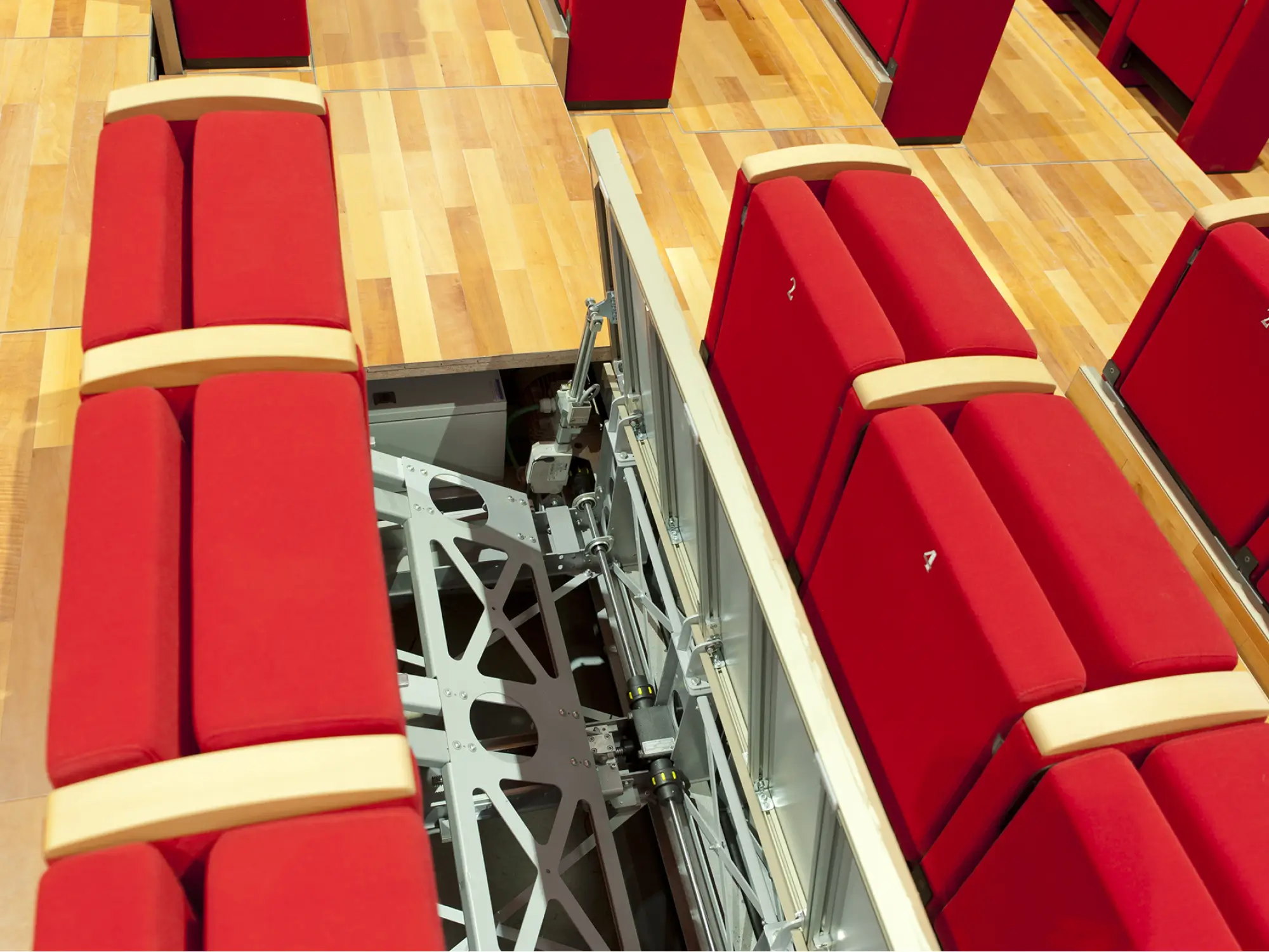 Capacity: modules from 2 to 4 seats (manual version); up to 16 seats per module in the motorised version, configurable on any surface – flat floor, stage or tiered seating