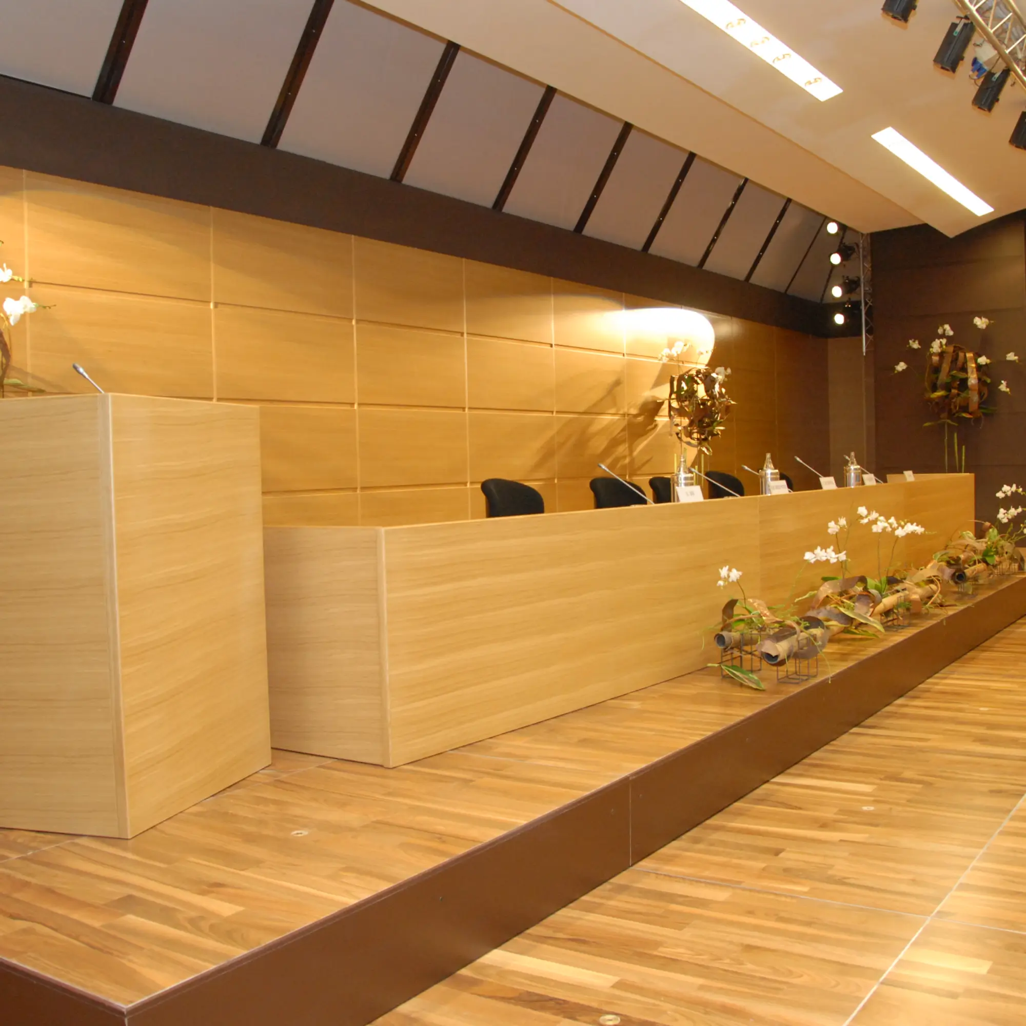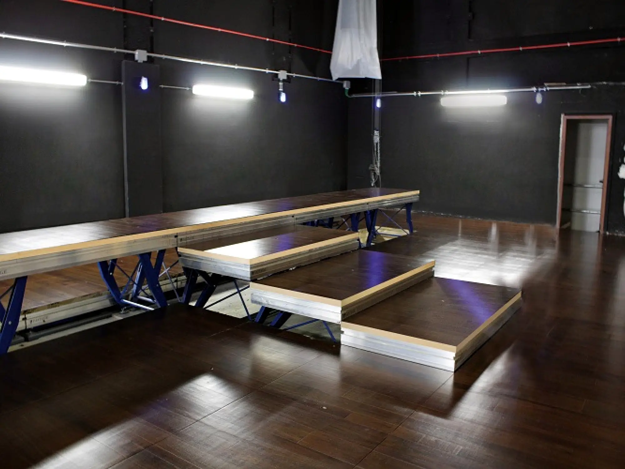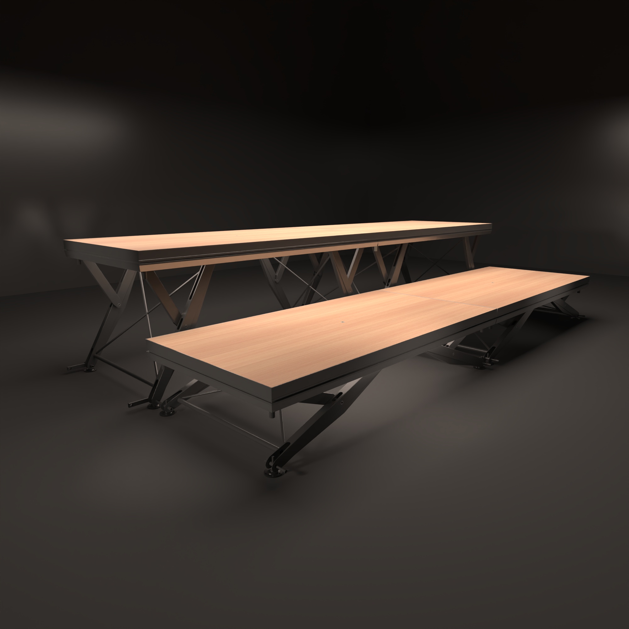 Flexstage is a modular platform with continuous mechanical adjustment, designed to offer quick, stable and precise solutions in theatrical and multi-purpose contexts.