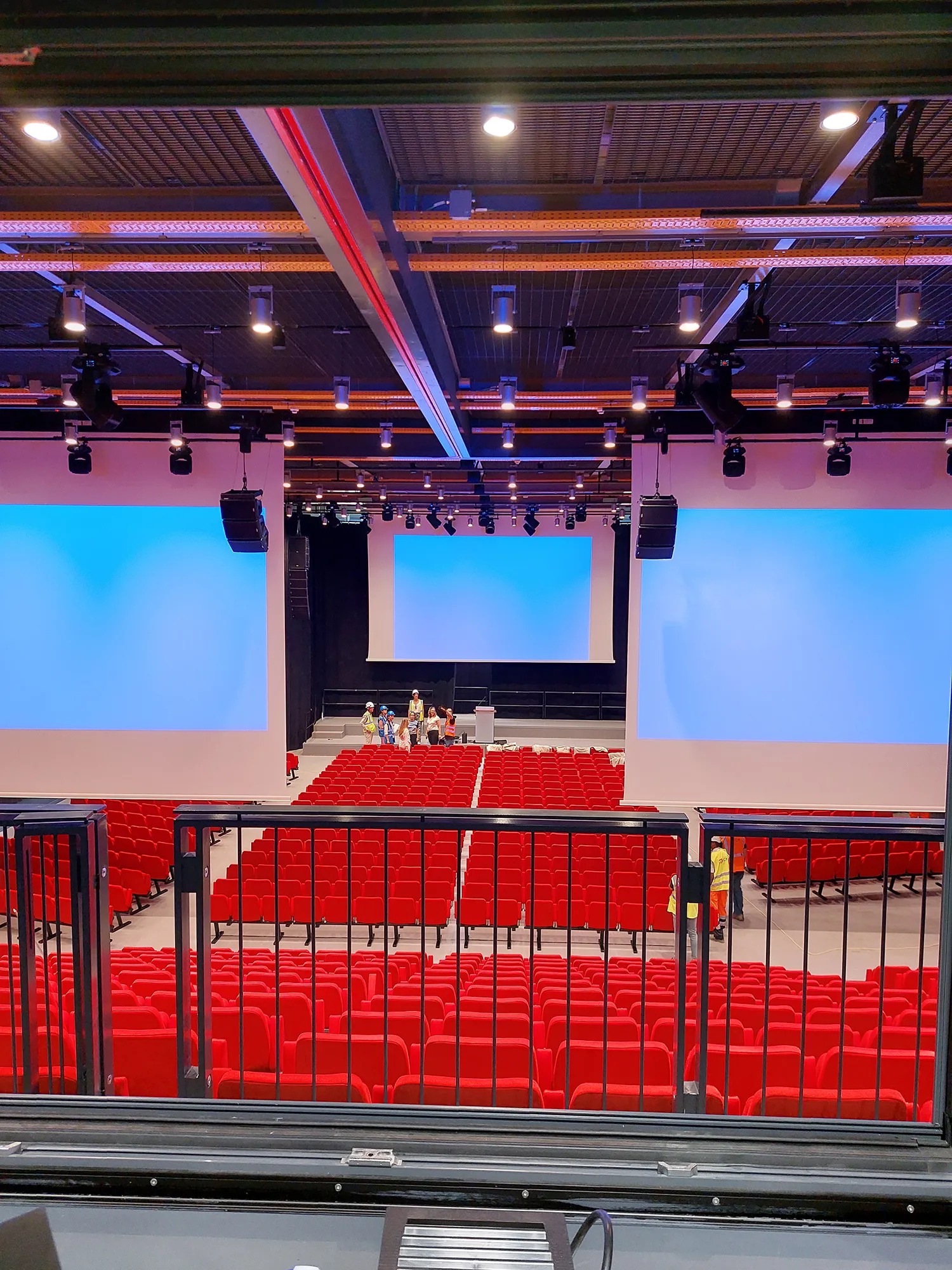 un sistema all’avanguardia incaricato di supportare sia la parte multimediale (audio, video) sia quella scenotecnica, interfacciato con la regia principale situata al livello superiore.