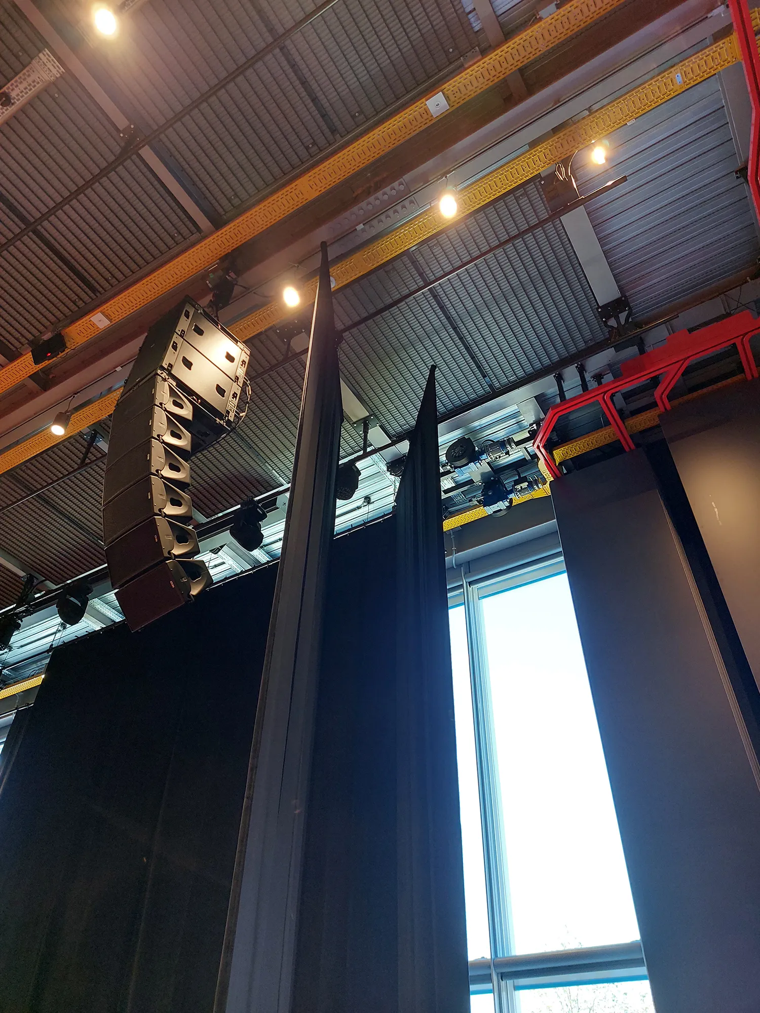 Meccanica superiore: 2 tiri motorizzati, 12 linee di americane fisse a soffitto dotate di PLB, staffe puntuali per l’appensione di paranchi a catena.