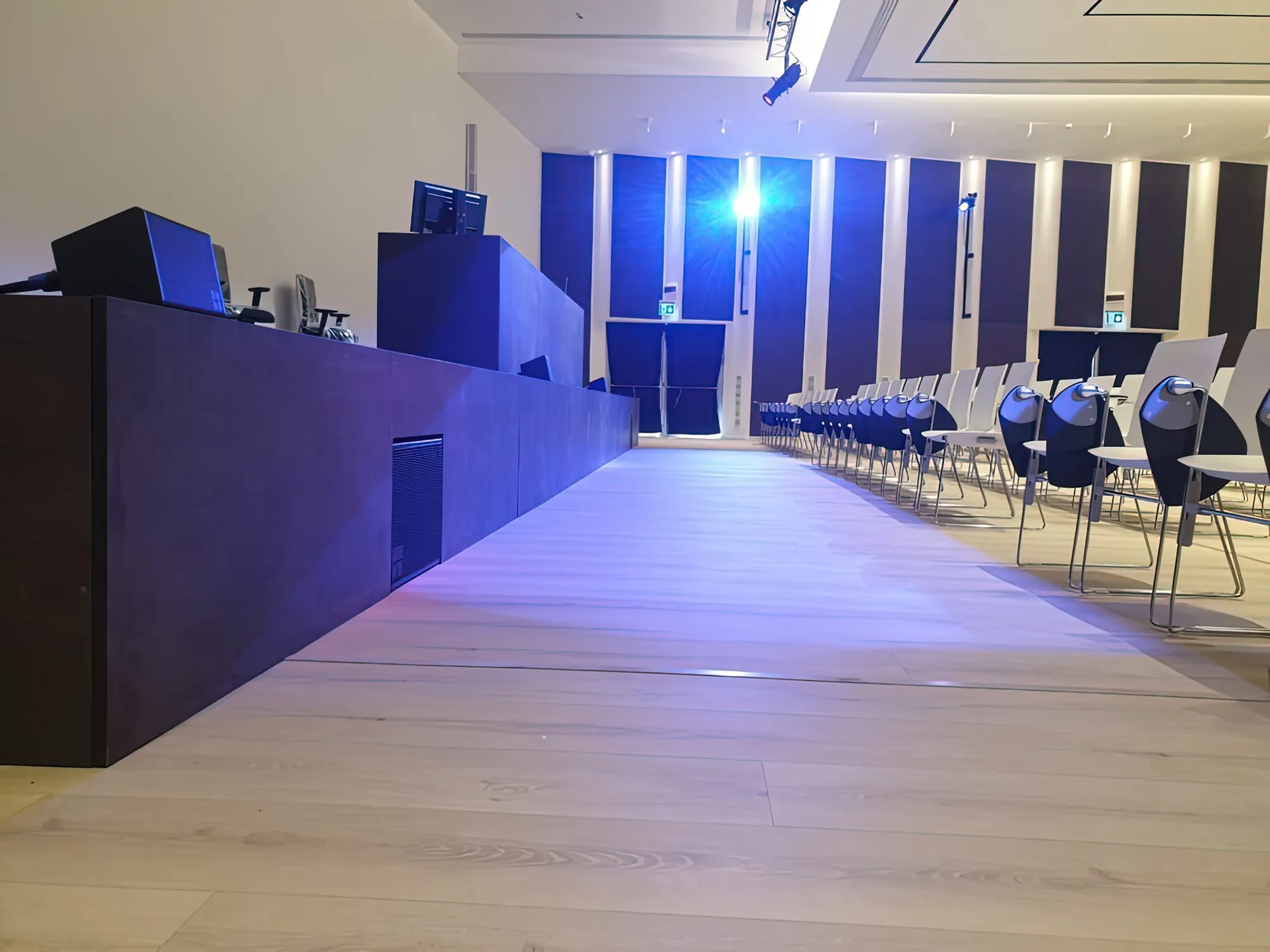 - Acustica: ottimizzazione della chiarezza del parlato e riduzione del riverbero. A tal fine, sono stati impiegati materiali assorbenti e diffondenti, insieme a soluzioni geometriche studiate per eliminare effetti acustici indesiderati, come echi multipli e riflessioni invasive.